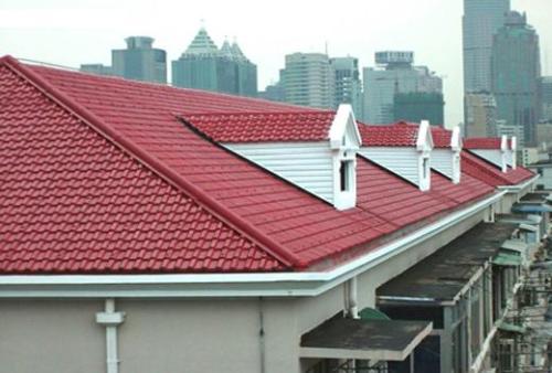 3:不適合平頂大跨度屋面,合成樹脂瓦的鋪設坡度要求在20度到80度,平頂的建筑不利于流水,不適合使用合成樹脂瓦。波形防水缺陷,市場的合成樹脂瓦一般都是仿古琉璃型的,這個瓦型設計傾向于美觀仿古的同時,忽略了建筑防水的需求,扁平弧線形的波峰加之2.5cm左右的波高滿足不了大跨度建筑屋面的流水需要,或許這就是當初設計者的定位。但是筆者建議大跨度,平坡度的建筑屋面慎用合成樹脂瓦作為主要屋面材料,當然可以配合些高波形的T型瓦加以搭配使用。目前成都坤寶建筑材料有限公司針對這種情況研發出一款波高4cm的合成樹脂瓦,算是對傳統合成樹脂瓦缺點的補償。